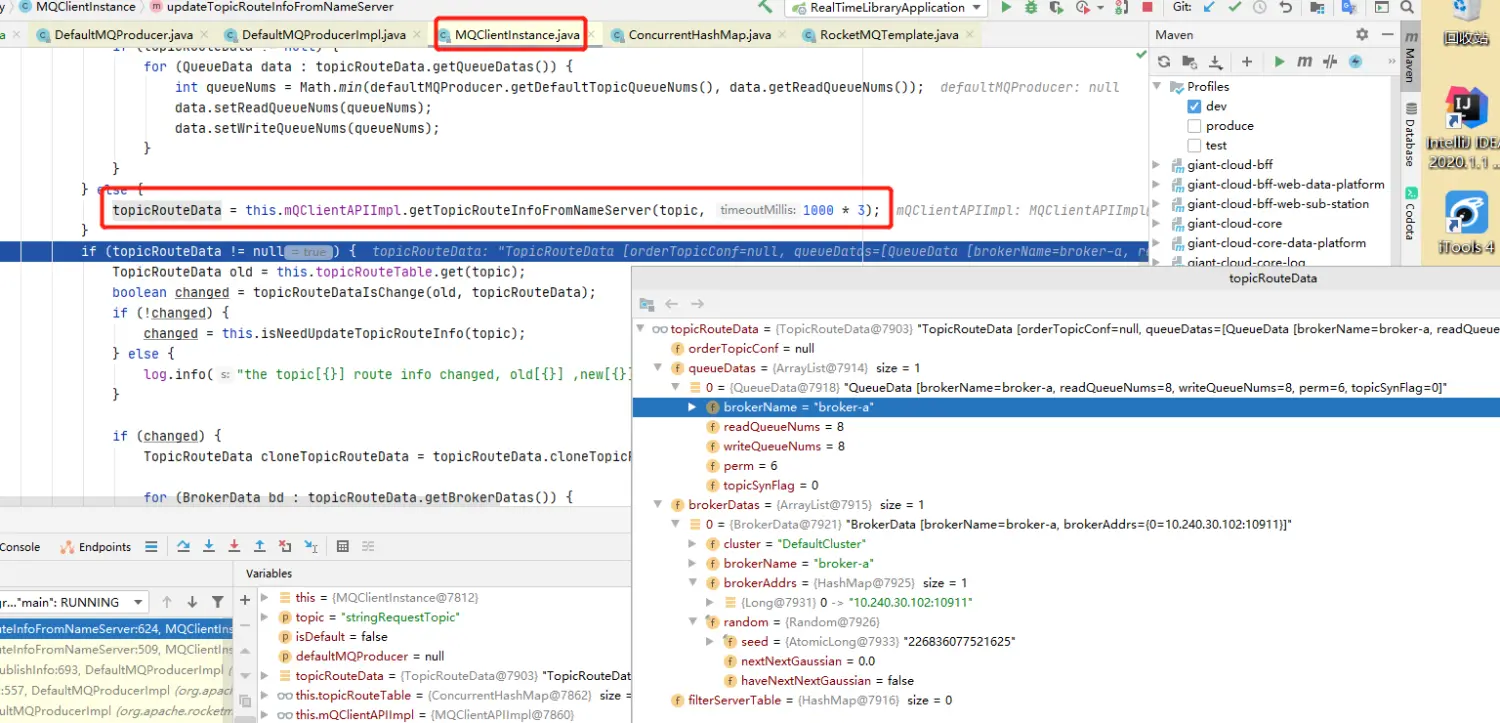 与我想象的不一样是,我查看源码发现会根据 topic 查到 topic 的路由信息,里面包含了 topic 所在 brokerName,只有 broker-a,也就是在集群之前给 broker-a 所创建的 topic,不会因为集群模式,而发送到别的 broker,即使我在 broker-b 使用 mqadmin 能看到 broker-a 的 topic。