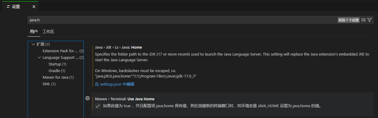 JDK路径,在设置,用户中搜索java.home,然后在 settings.json 中配置:"java.jdt.ls.java.home": "D:\tool\java\java17",